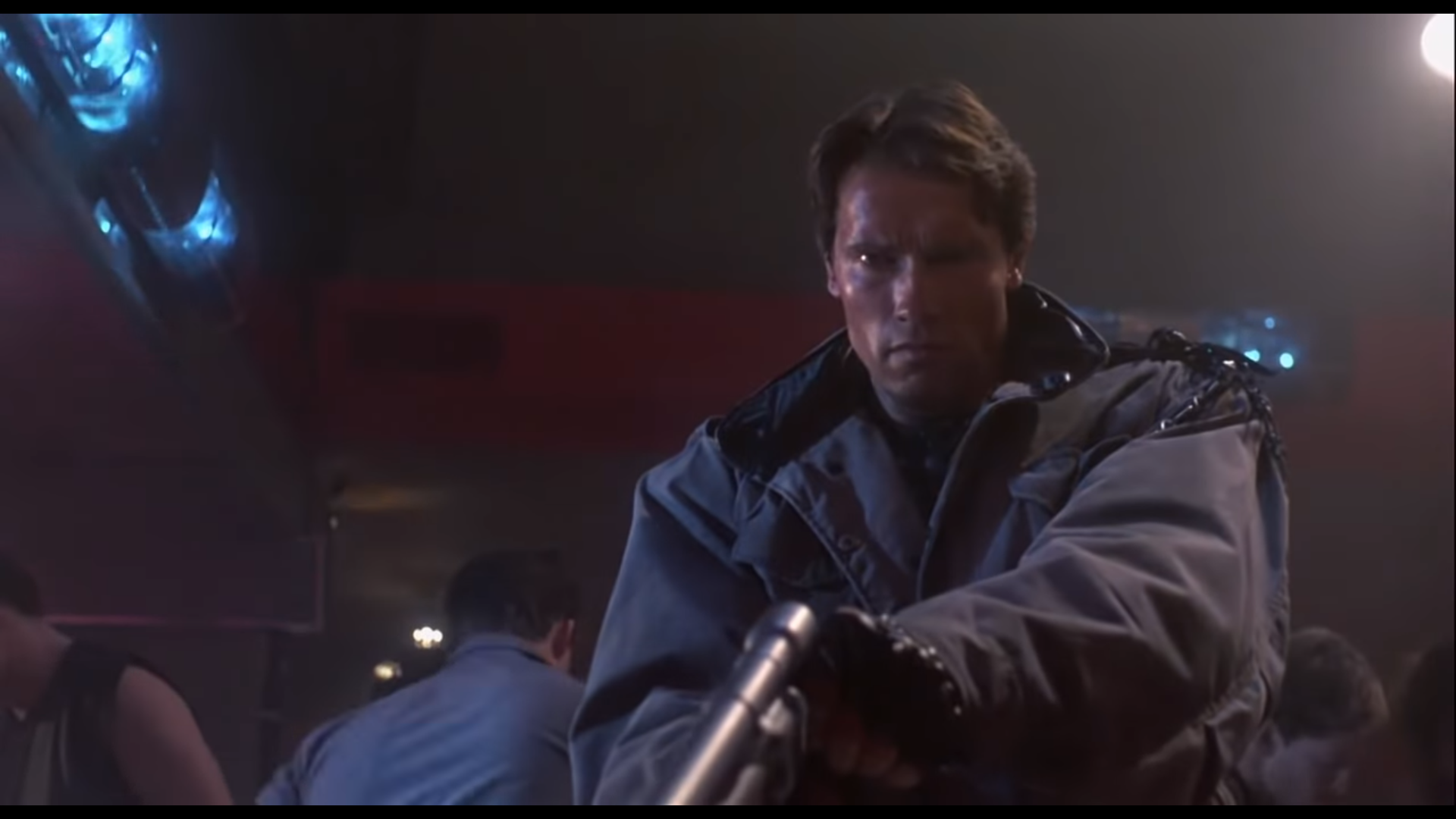 Of course, you probably already know that, because even if you haven’t seen this film before you’ve probably picked up the basic premise over the years through the constant winking other films, tv shows, and video games make towards this classic. So, if you haven’t watched it yet, is it even worth going back to? Well, yes. For a start this movie proves that Arnold is a better actor than he is sometimes credited for. His physical presence is an absolute necessity here. We see him emerge from his time travel completely nude, and frankly magnificent in his muscle-bound glory. Throughout the film his literally enormous presence visually separates him from the actual humans. But Arnold’s brilliance here is not solely down to his biceps. There is stillness to his face, and a preciseness to his movements which ensures that although human in appearance, there is never really any doubt that at heart the terminator is a machine. Strangely, despite being a killing machine, he does also already have the comic timing that we will see more of in the sequel. When buying weapons from a store he begins to load a gun, which the clerk obviously has a problem with.
